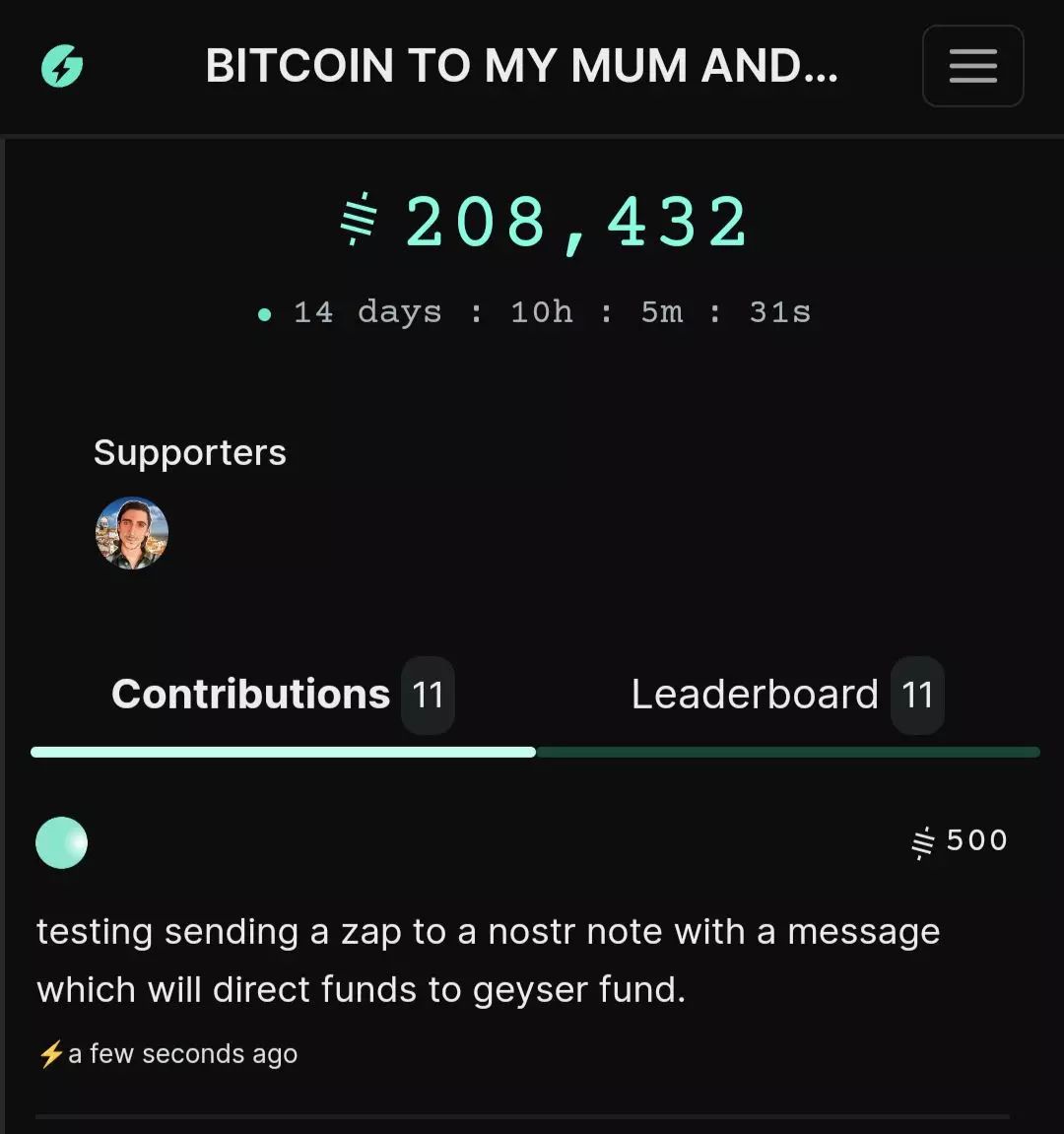 To my surprise, the integration was flawless. The message I sent was received along with the donation to the Geyser Fund platform and was displayed on the site like magic!