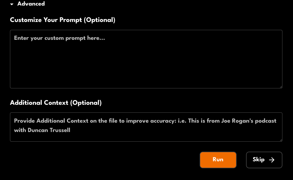 Choose the prompt to generate content (or skip to just transcribe). You have 9 default options including creating your own Custom Prompt: