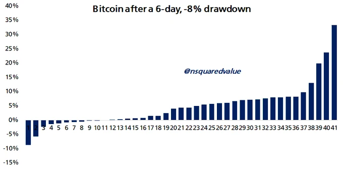 âĄď¸Timothy Peterson: 'Bitcoin is down -8% in the past 6 days. This has happened 41 times since 2022. What happens next? In the following 6 days, Bitcoin was up 66% of the time. The average gain was 8%. If it did lose money, the average loss was only -3%.'