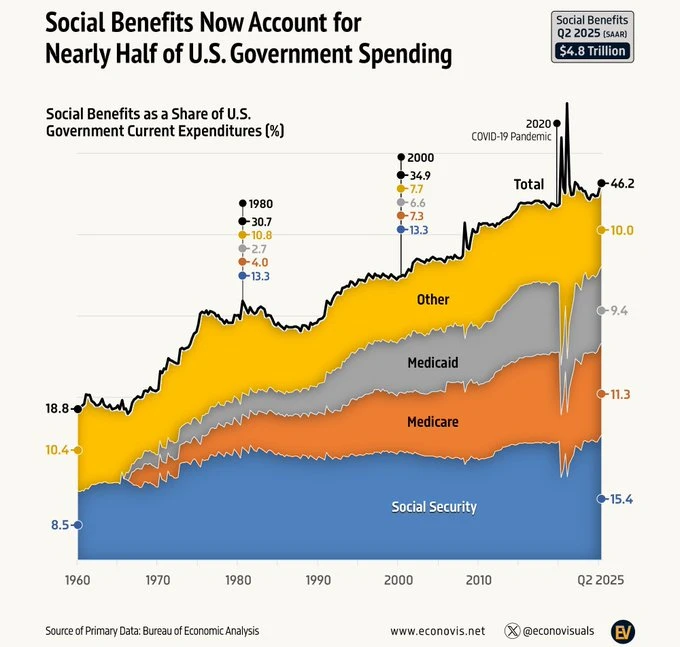 đđ˝'What a trend, just in case someone was wondering why the US has a fiscal deficit and debt problem. Any country with social benefits increasing at this rate would get in trouble.' - Michael A. Arouet