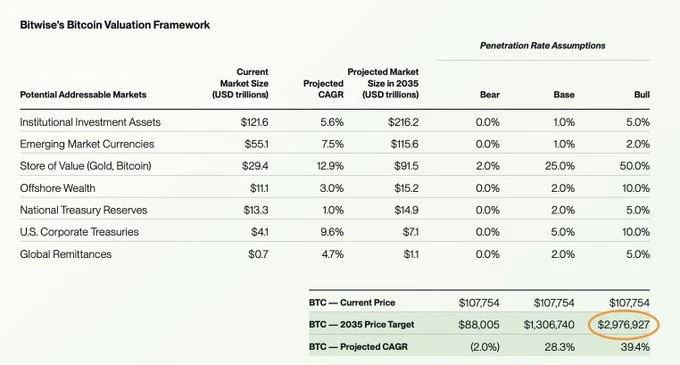 âĄď¸In its inaugural âBitcoin Long-Term Capital Market Assumptions,â Bitwise lays out its bull case: Bitcoin hitting $2.9 million by 2035.