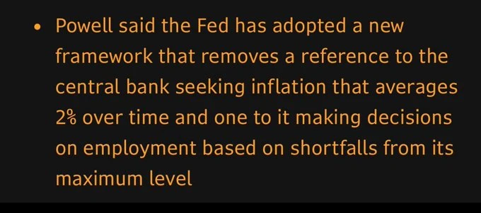 âĄď¸'Powell, Chair of the Federal Reserve, says the Fed is moving away from its strict 2% inflation framework. Theyâre going to let inflation run hot. Buy as much Bitcoin as you can.' - Bitcoin Archive