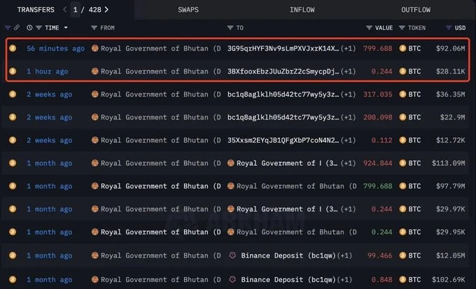 âĄď¸Bhutan government transfers 800 BTC ($92M). Bhutan holds 9,969 BTC ($1.15B).