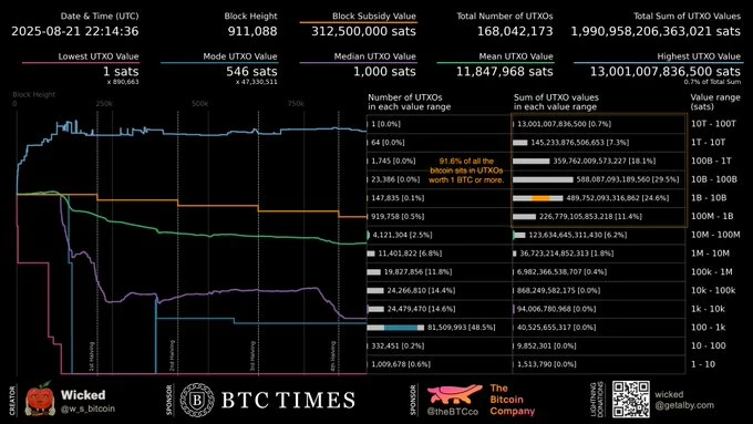 âĄď¸Wicked: 91.6% of all the bitcoin sits in UTXOs worth 1 BTC or more.