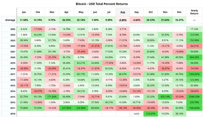 âĄď¸'Bitcoin has spent less than ~3 days at this price level. It's healthy to revisit and spend some time here. We're entering the weakest month for BTC seasonally, which is followed by its (historically) two best months. Go outside, touch grass, breathe, enjoy life.' - Joe Consorti
