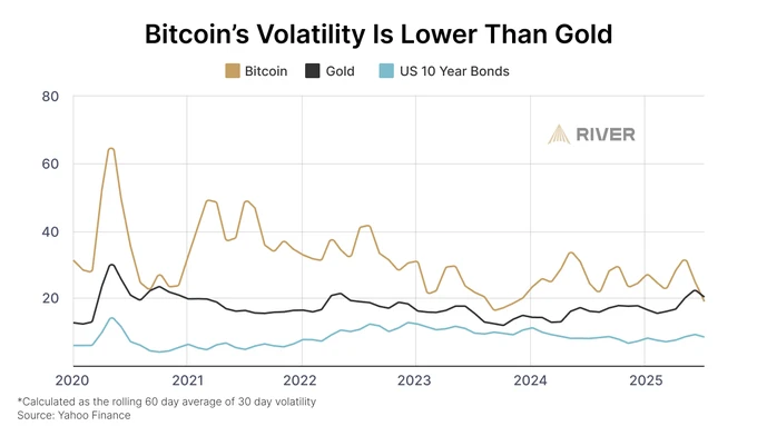 âĄď¸River: Bitcoin's volatility has been lower than gold's for the longest period in history.