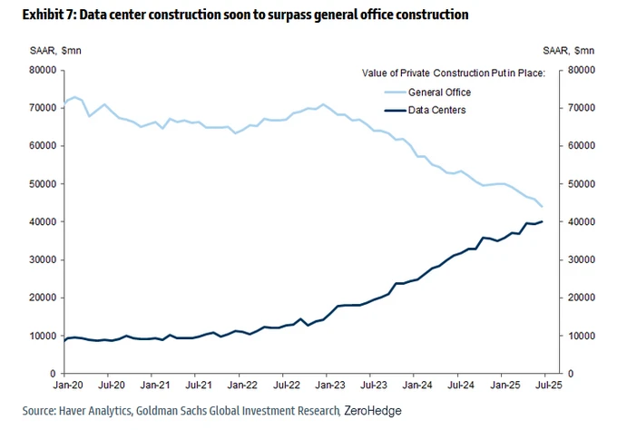 The most insane chart: the value of data centers being built will surpass all offices in construction within 6 months. Context: There are now $40 BILLION worth of US data centers under construction, up +400% since 2022. For the first time in history, the value of US data centers under construction will soon EXCEED office buildings. This is a historic shift.