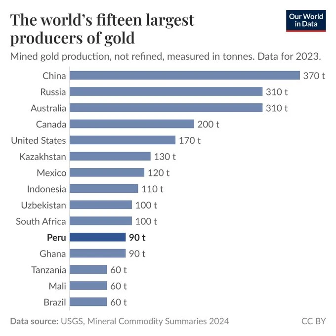 "Gold export data suggests that Peru, one of the worldâs largest producers, mines nearly as much informally as it does formally. According to official mining output records, Peru mined about 90 tonnes of gold in 2023, far ahead of any other South American country. That puts it within the worldâs top 15 producers, just below the 10th place, as shown in the chart. However, this official figure captures only part of Peruâs gold economy. Customs export data shows a striking discrepancy: about 80 tonnes of unaccounted gold in 2023, according to the Peruvian Institute of Economics. Thatâs gold whose value appears in export statistics but not mine-output records â and it is almost as large as the official figure based on mine records. Some of this gap may be due to re-exports, inventories, or recycled gold. But given how big the discrepancy is, Peruâs authorities, researchers, and media see it as a practical indicator of the scale of informal and illegal mining. An article in The Economist, for example, compares Peru with other countries using this approach, and argues that gold has become more profitable than drugs for many gangs in South America. Illegal gold mining is widely recognized as a major issue in Peru and the region, frequently linked to environmental damage and organized crime. This context matters today: the steep recent increase in gold prices raises incentives around unregulated extraction and trade."