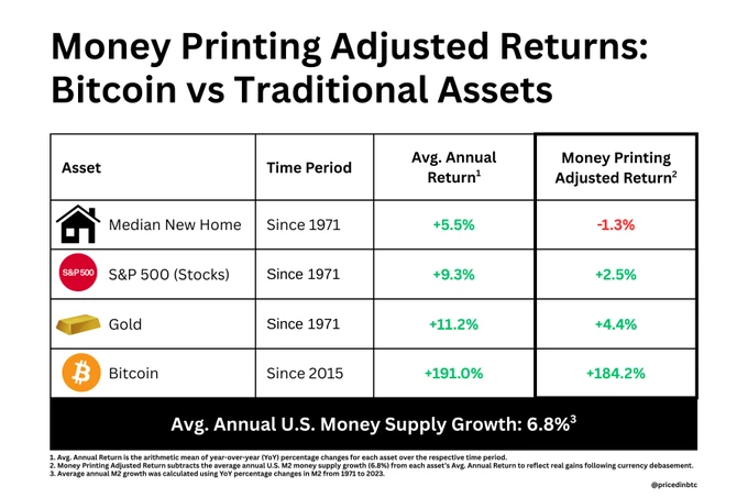 'āærrr⦠only one asset outruns the printer. Since 1971, most assets have barely outpaced 6.8% annual money supply growth. The median U.S. house failed entirely to keep up with U.S. dollar debasement. āæitcoin delivers real wealth preservation and generation.'