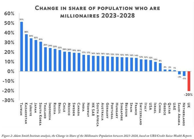 'Average wealth in Britain fell the second most of any major economy in 2024, according to a closely followed global study, piling fresh scrutiny on the country’s battle to stem an exodus of its wealthiest residents and kickstart its flagging economy. According to UBS’s annual Wealth Report, mean household wealth in Britain fell 3.6 percent over the course of last year, reversing a trend of healthy growth that has seen it swell by over six percent since the start of the decade. The only country that eclipsed the UK households’ wealth drop was crisis-ridden Turkey, which is in the grips of a self-inflicted economic crisis that in 2024 saw inflation top 75 percent and interest rates reach an eye-watering 50 percent. Average wealth in the Eurasian economy fell over 14 percent in real terms, the study said' - City A.M.