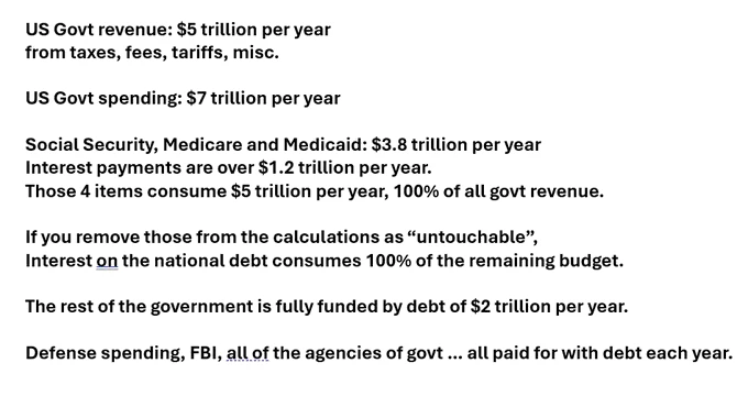 Those 4 items consume $5 trillion per year, 100% of all govt revenue. Everything else the US govt does is paid for with $2 trillion (or more) debt each year.