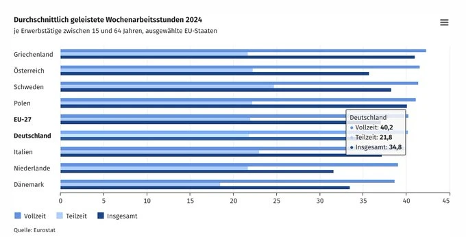 👉🏽'In Germany people work fewer hours than most European neighbors. On avg, Germans work just 34.8 hours per week, well below the EU average of 37.1 hours. The reason? A high number of part-time workers. If you look only at full-time employees, Germans work 40.2 hours per week, almost exactly in line with the EU average of 40.3. In 2024, 29% of working Germans aged 15 to 64 had part-time jobs – a rate only surpassed by the Netherlands (43%) and Austria (31%). The EU average was just 18%.' - Holger Zschaepitz