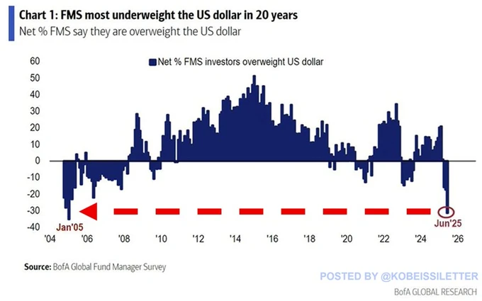 👉🏽' A net 31% of institutional investors are underweight the US Dollar, the most in 20 years, per Bank of America. This has declined by ~52 percentage points over the last 5 months. Furthermore, asset managers and leveraged funds' net positioning on the US Dollar has fallen to near its lowest in 3 years. As a result, the US Dollar index has declined 9% year-to-date, marking its worst performance this century. This puts the US Dollar now on track for its biggest drop in the first half of the year since 1986. The US Dollar is historically unpopular right now.' -TKL