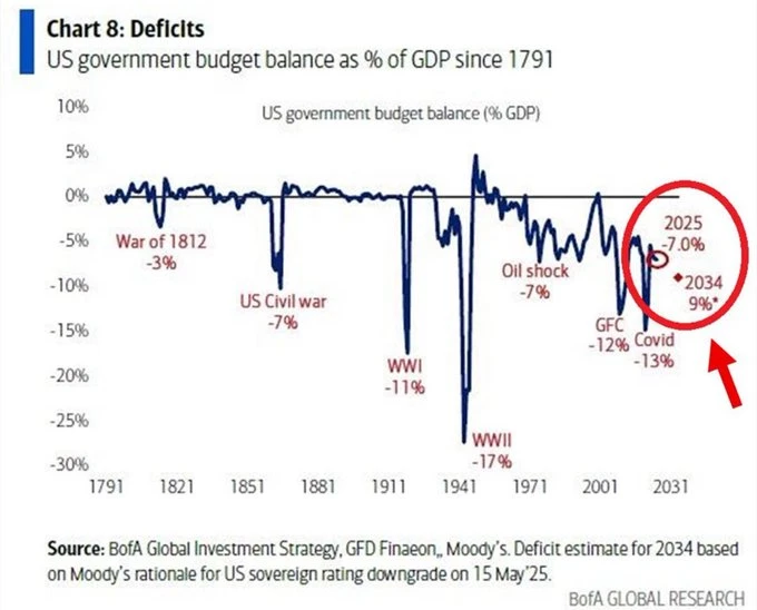 👉🏽US budget deficit to hit 9% of GDP by 2034, a level historically seen only during wars or severe crises. This projection assumes no recession and no lower interest rates. Fiscal insanity is the new normal.