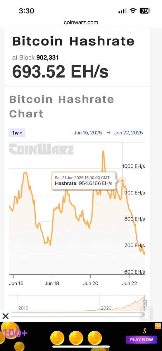➡️SageM: 'Holy Sh**! The global hash rate dropped like a rock around the same time nuclear sites were bombed by the US. Could it be Iran has nuclear-powered asics as a way to convert energy into Bitcoin under the radar to fund their operations?'
