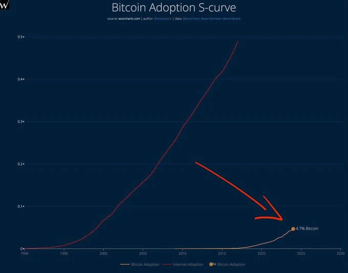 ➡️I will keep posting the following chart. Bitcoin is at 4.7% world adoption, the same as Internet Adoption in 1999. We are so early.