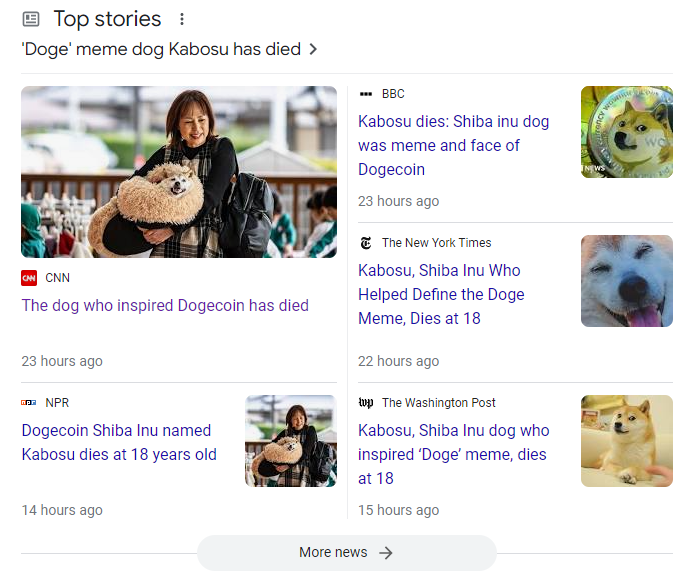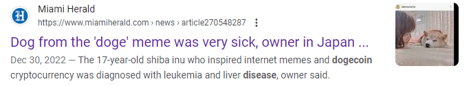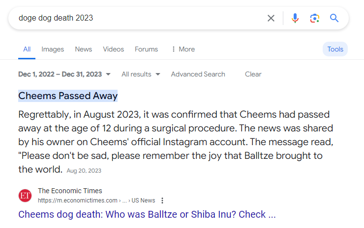 To be fair, I searched a bit more. I narrowed the target dates to Dec. 1, 2022 to Dec. 31, 2023. Sure enough, it was reported then that the dog had died, Cheems, that is.