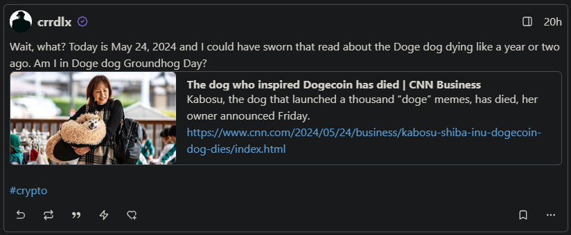 And yet, the Doge's death yesterday immediately had me thinking, "Wait, I recall that pup died a year or two ago." I wrote and posted this showing my confusion: