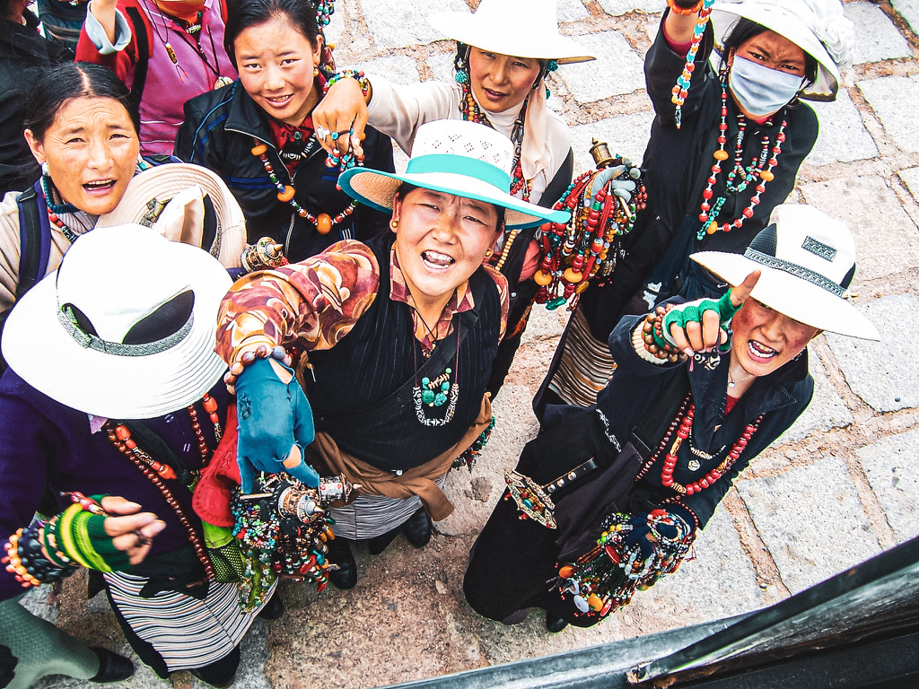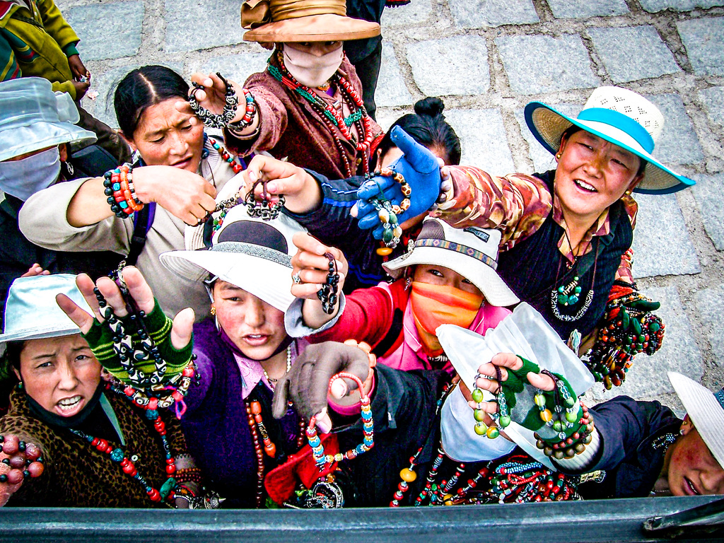 Walking down the long hill from the Potala place, we arrived back at the waiting area for our bus. Of course this area was full of Tibetan locals - both as street vendors and as people watchers looking to catch a glimpse of foreign visitors. Most intriguing to me were the women selling Tibetan jewelry - with their unique, gypsy-merchant style of dress, striking facial features, and altitude-kissed red-brown complexions. As we were waiting to depart, they gather around outside the large open window on the side of the bus where I happened to be sitting - allowing me to snap a few pictures their hurried, harried, and vibrantly colored commercial frenzy.