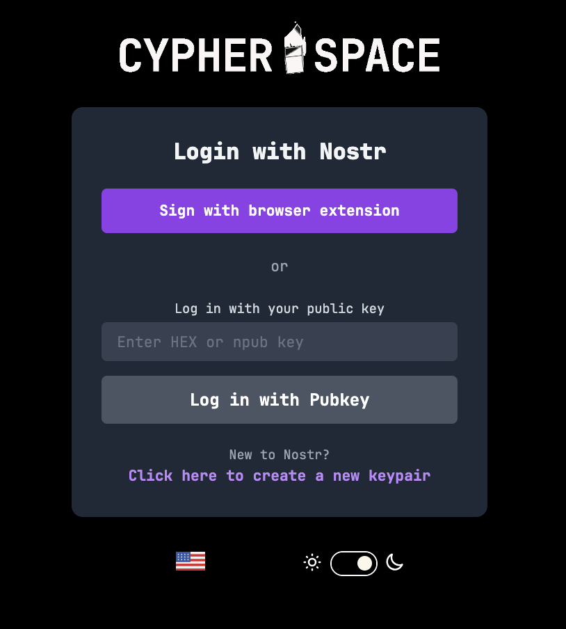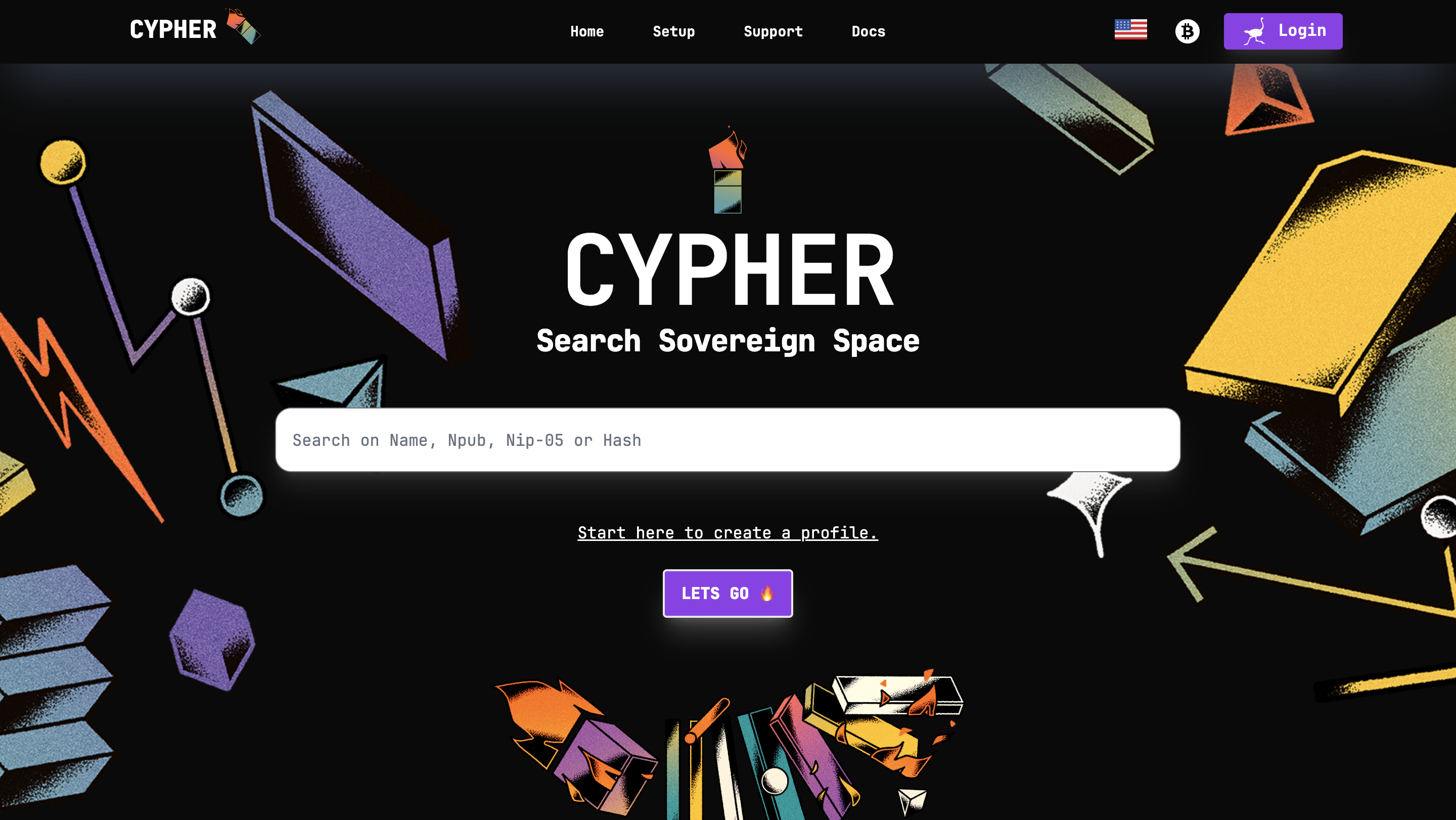 The home page is clean with the ability to search for profiles by name, npub, or Nostr address (NIP-05).