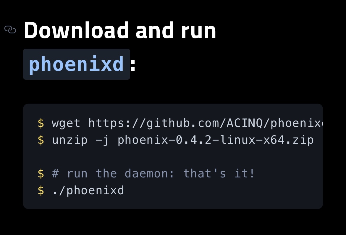 $ wget https://github.com/ACINQ/phoenixd/releases/download/v0.4.2/phoenix-0.4.2-linux-x64.zip