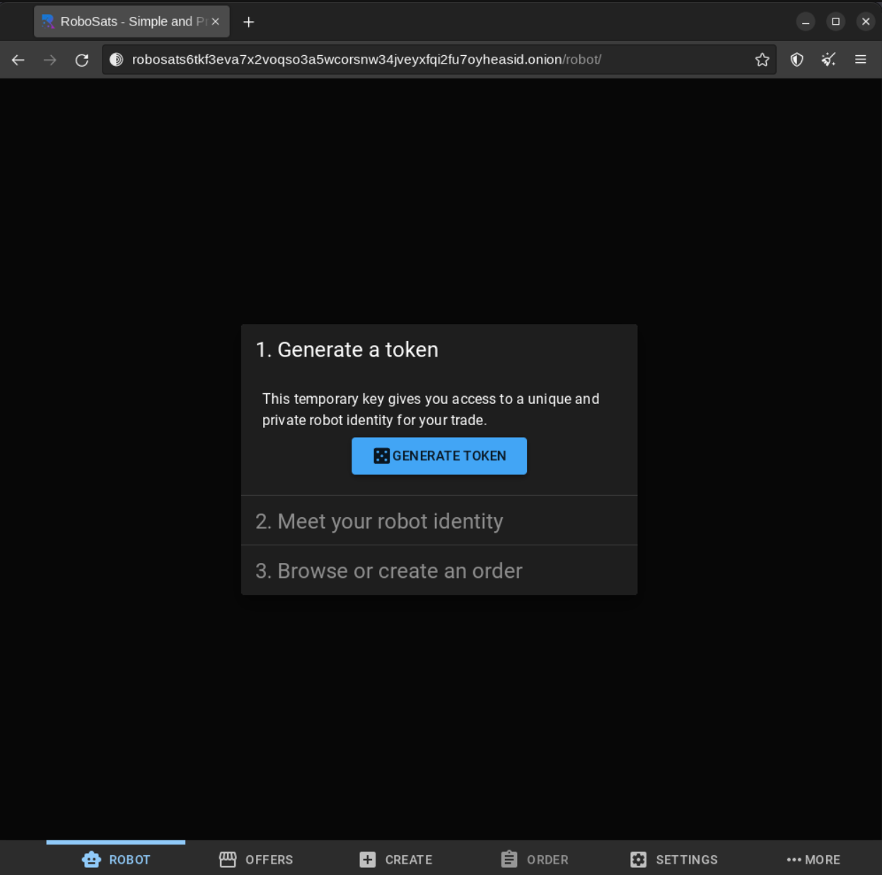 So now you're on Robosats. Hit that generate button and the magic begins. A "robot" is set for you, which in the background is a PGP keypair that's also used to encrypt communications between yourself and the seller once a trade has begun.